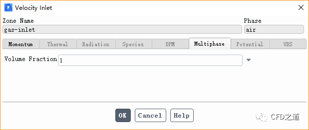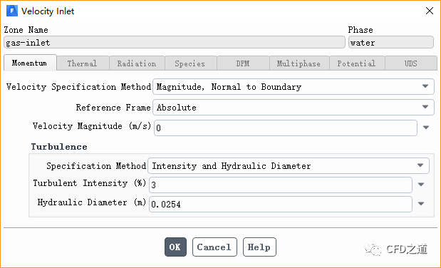 鼠标双击模型树节点Boundary Conditions > gas_inlet > water,弹出的对话框中采用下图所示参数设置