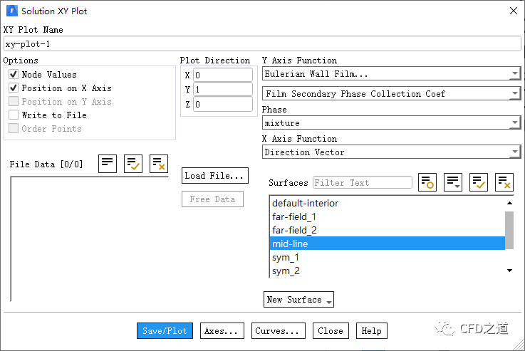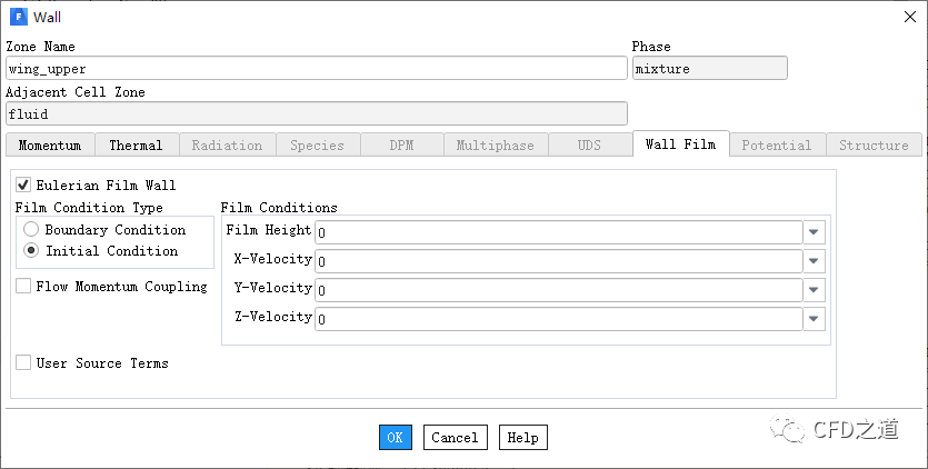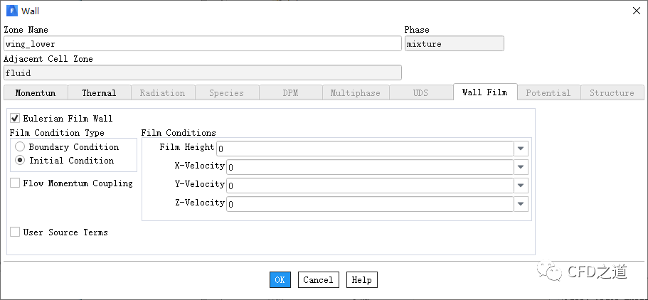 打开边界wing_lower,如下图所示激活选项Eulerian Film Wall,并选择选项Initial Condition,其他参数保持默认设置