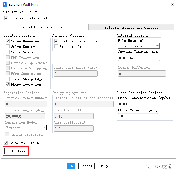 进入EWF模型设置面板,点击按钮Initialize初始化液膜分布