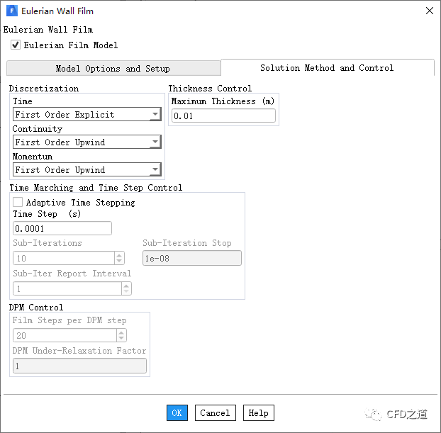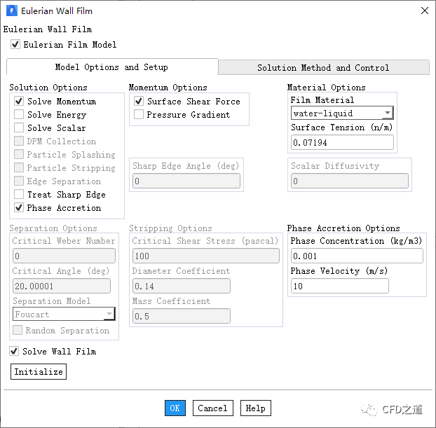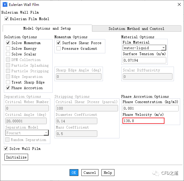 激活Eulerian Wall Film模型,如下图所示设置模型参数