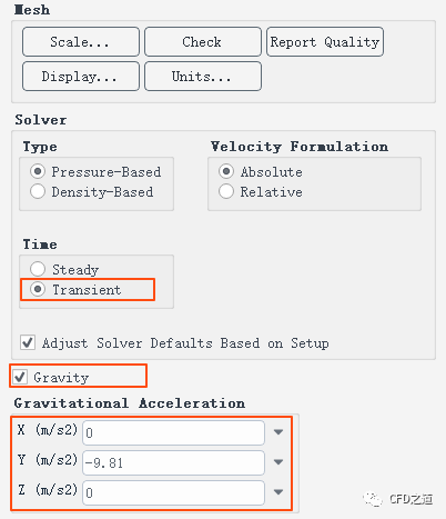 进入General面板,激活选项Transient,设置重力加速度为Y方向-9.81