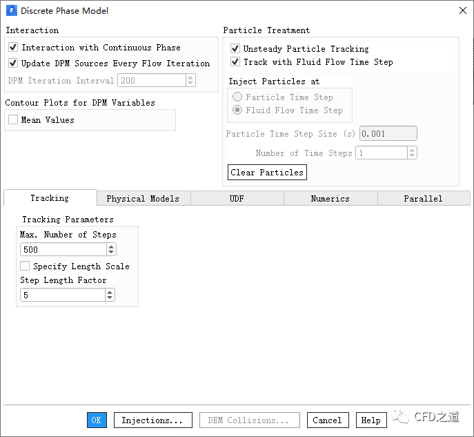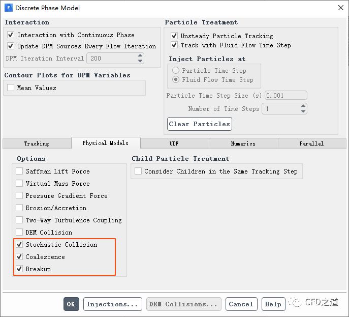 鼠标双击模型树节点Models → Discrete Phase Model,弹出设置对话框,如下图所示,激活选项Interaction with Continuous Phase及Update DPM Sources Every Flow Iteration,其他参数保持默认设置