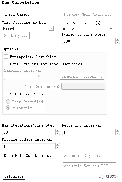 鼠标双击模型树节点Run Calculation,右侧面板设置Time Step Size为0.002 s,设置Number of Time Steps为500