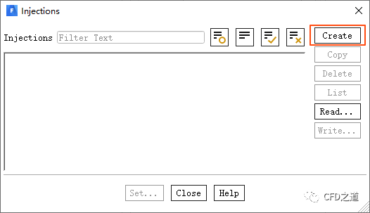 鼠标双击模型树节点Models → Discrete → Injection弹出入射器设置对话框,点击按钮Create创建入射器