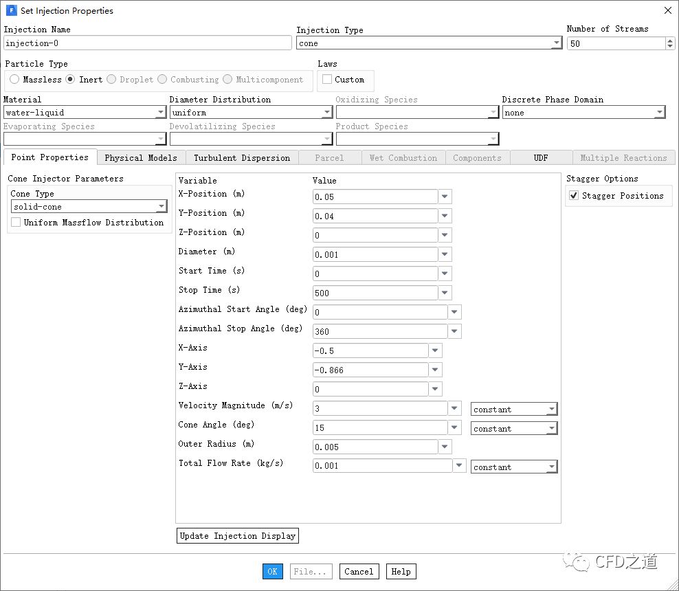 如下图所示,设置Injection Type为cone,设置Number of Streams为50