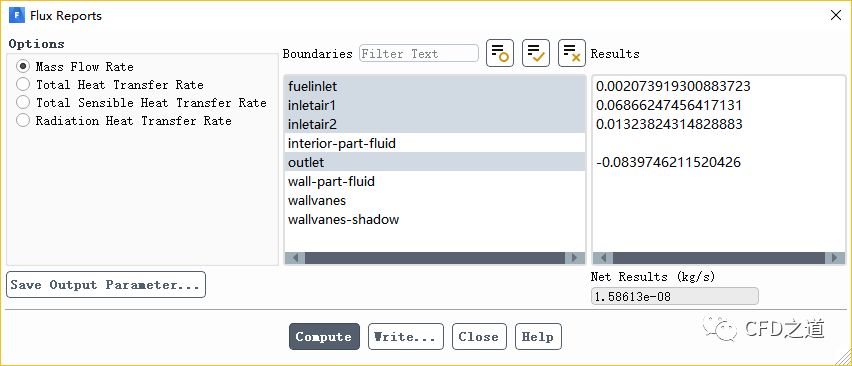 双击模型树节点Results > Reports > Fluxes,弹出设置对话框,如下图所示查看进口与出口的流量