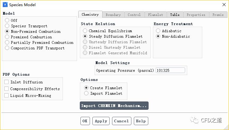 进入Chemistry标签页,激活选项Steady Diffusion Flamelet启用稳态扩散小火焰模型