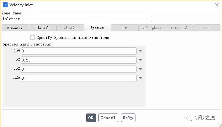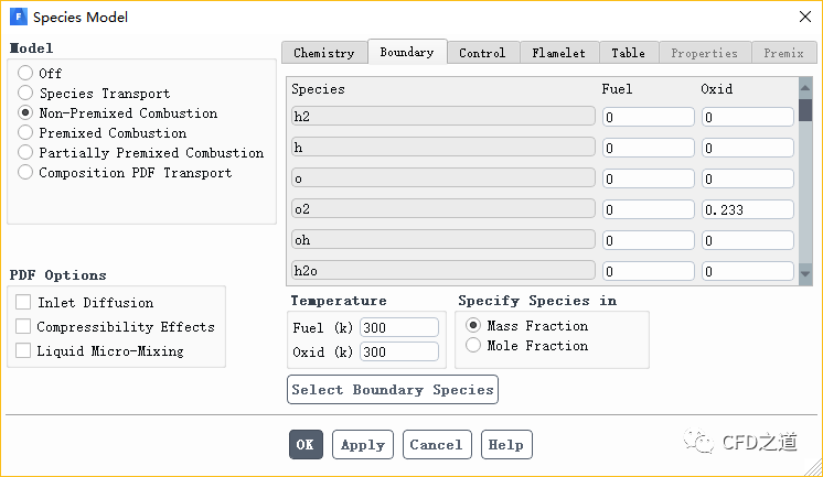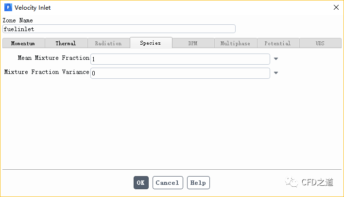 鼠标双击模型树记得Boundary Conditions > fuelinlet弹出设置对话框,切换至Species标签页,设置Mean Mixture Fraction为1,点击OK按钮关闭对话框
