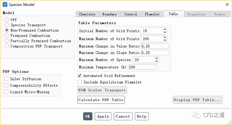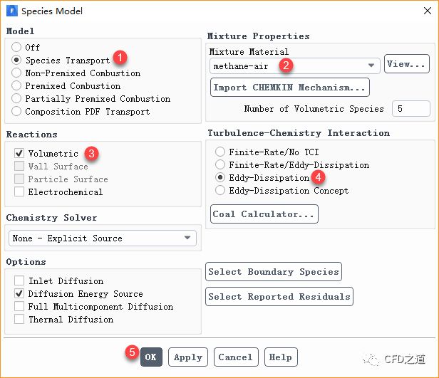 鼠标双击模型树节点Models > Species弹出设置对话框,激活选项Non-Premixed Combustion