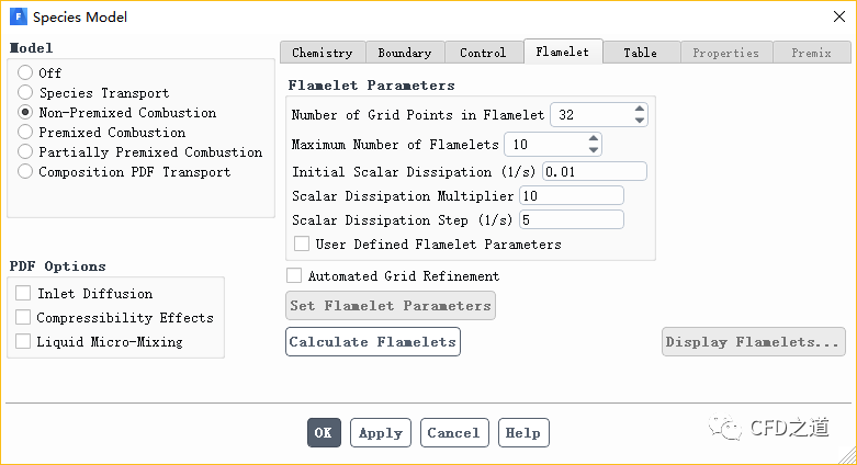 进入Flamelet标签页,采用默认参数,点击按钮Calculate Flamelets创建小火焰数据并保存至文件中