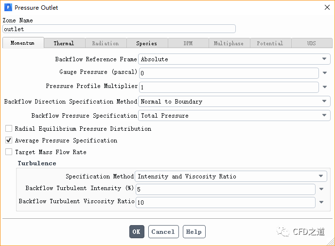 鼠标双击模型树节点Boundary Conditions > outlet弹出设置对话框,如下图所示,激活选项Average Pressure Specification,其他参数保持默认设置,点击OK按钮关闭对话框