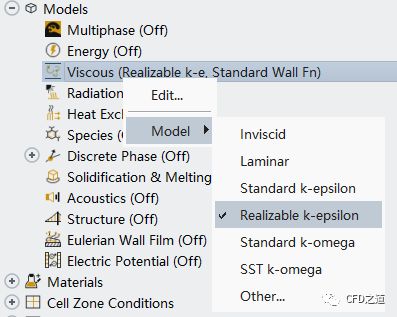 右键选择模型树节点Models > Viscous,点击弹出菜单项Model → Realizable k-epsilon激活湍流模型