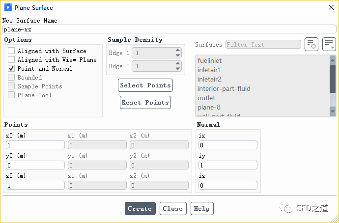 如下图所示,创建原点为(1 0 1),法向方向为(0 1 0)的平面,将其命名为plane-xz