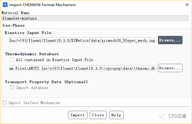 点击按钮Import CHEMKIN Mechanism…打开化学反应机理导入对话框,如下图所示,导入机理文件grimech30_50spec_mech.inp