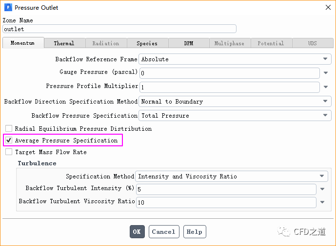 鼠标双击模型树节点Boundary Conditions > outlet,弹出对话框中激活选项Average Pressure Specification,点击OK按钮关闭对话框