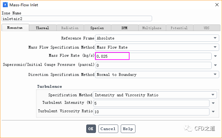 鼠标双击模型树节点Boundary Conditions > inletair2,弹出对话框中设置Mass Flow Rate为0.025 kg/s