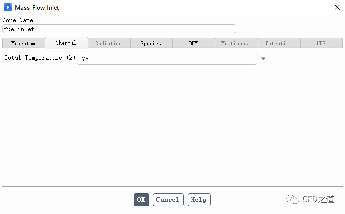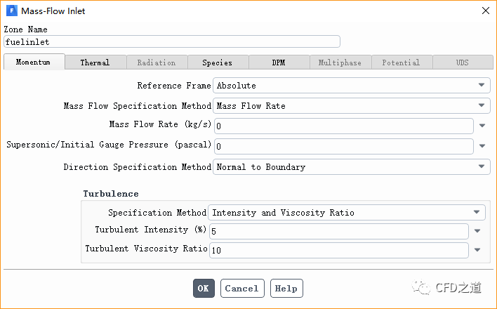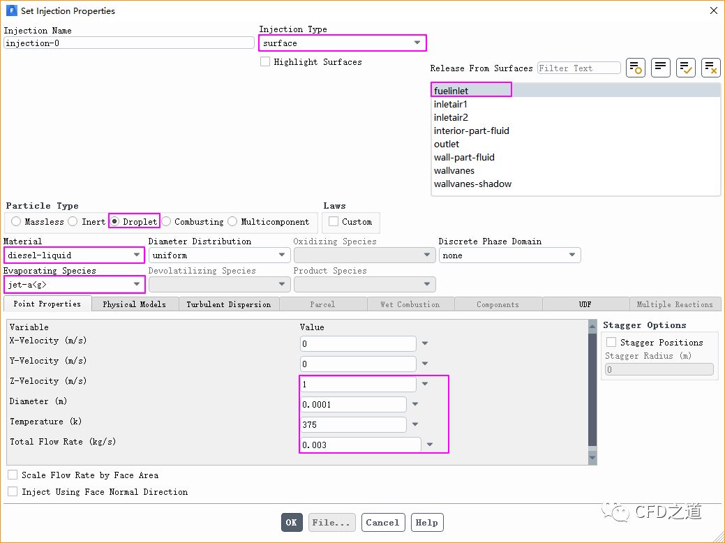 如下图所示,设置Injection Type为Surface,设置Release From Surfaces为fuelinlet