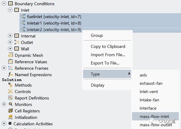 选中模型树节点fuelinlet、inletair1及inletair2,点击鼠标右键,选中弹出菜单项Type → mass-flow-inlet将边界类型设置为流量入口边界