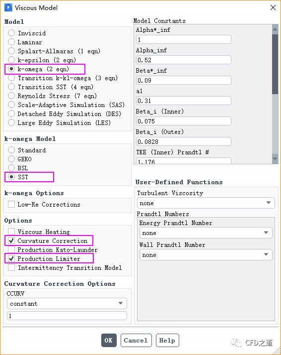鼠标双击模型树节点Models > Viscous,弹出设置对话框,如下图所示,激活SST k-omega湍流模型,激活选项Curvature Correction,点击OK按钮关闭对话框