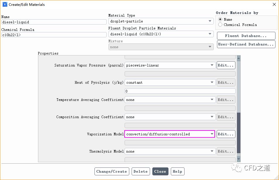 设置Vaporization Model为convection/diffusion-controlled,点击按钮Change/Create修改参数