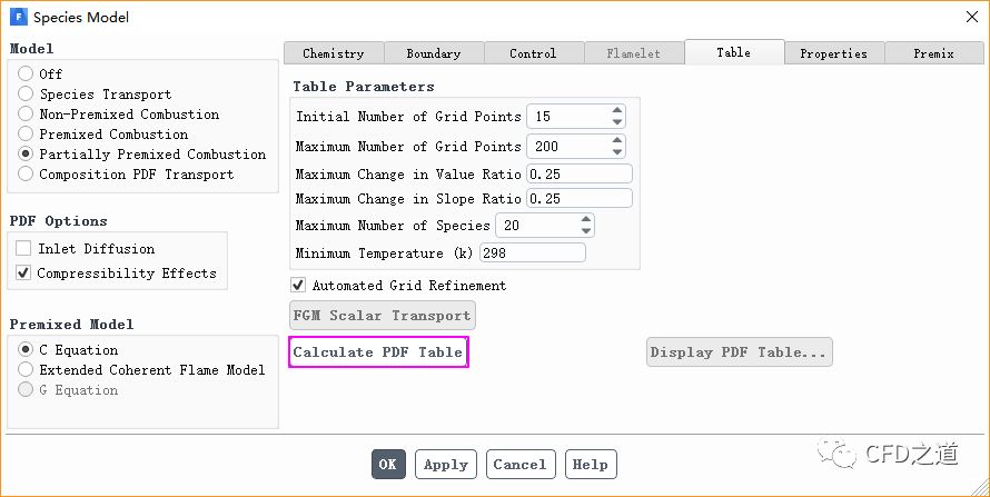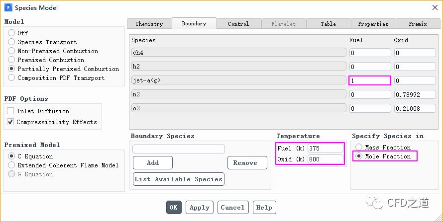 鼠标双击模型树节点Models > Species弹出设置对话框,激活选项Partially Premixed Combustion