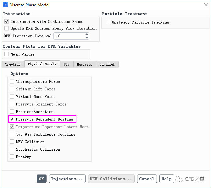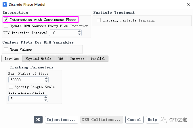 鼠标双击模型树节点Models > Discrete Phase Model,弹出设置对话框,如下图所示,激活选项Interaction with Continuous Phase