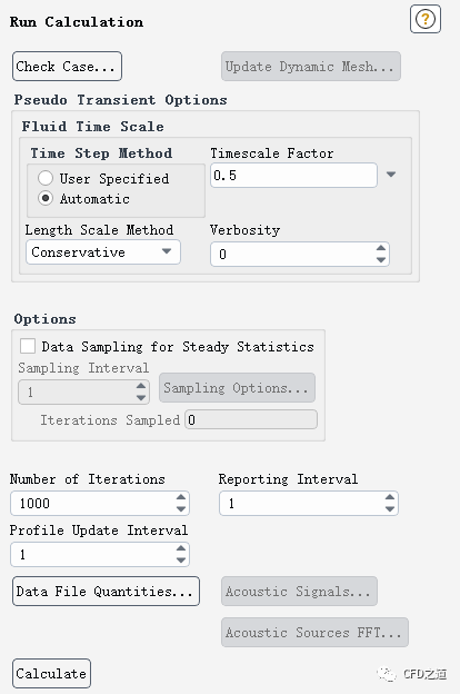 鼠标双击模型树节点Run Calculation,右侧面板如下图所示设置参数Timescale Factor为0.5,设置Number of Iterations为1000
