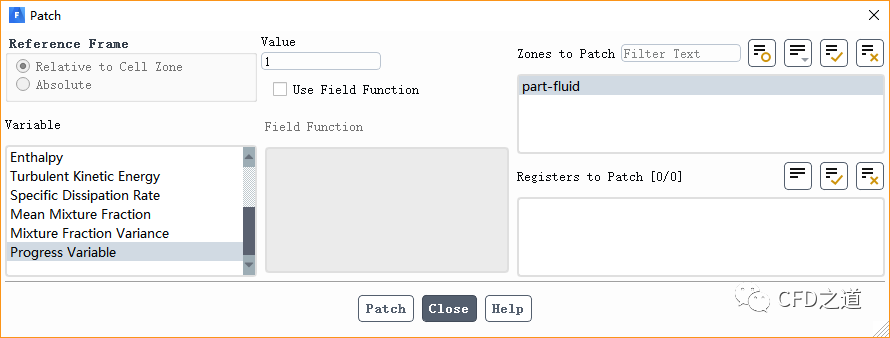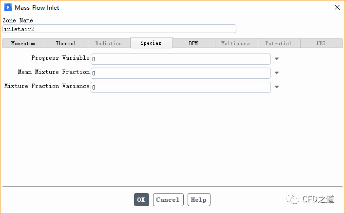 切换至Species标签页,设置Mean Mixture Fraction为1,设置其他参数为0,点击OK按钮关闭对话框