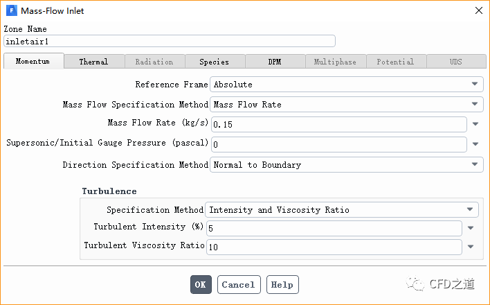 鼠标双击模型树节点Boundary Conditions > inletair1,弹出对话框中设置Mass Flow Rate为0.15 kg/s