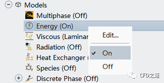 右键选择模型树节点Models > Energy,点击弹出菜单项On激活能量方程