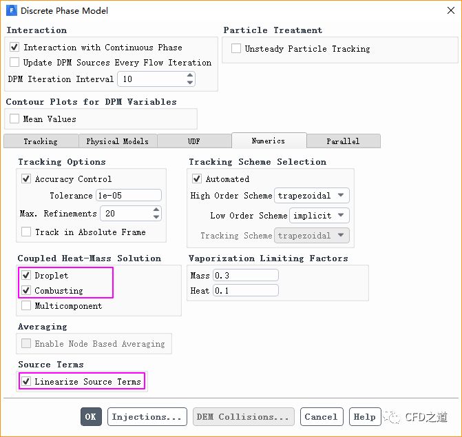 进入Numerics标签页,激活选项Droplet及Combusting,激活选项Linearize Source Terms