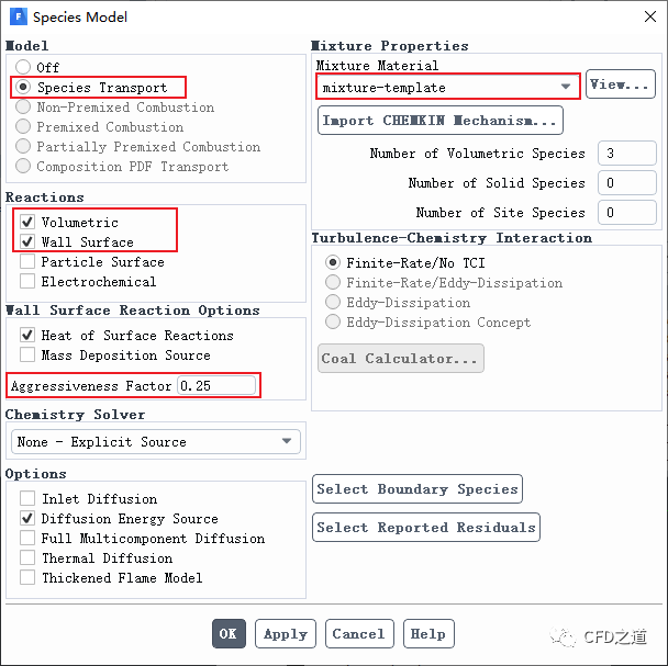如下图所示启用Species Transport模型,激活选项Wall Surface