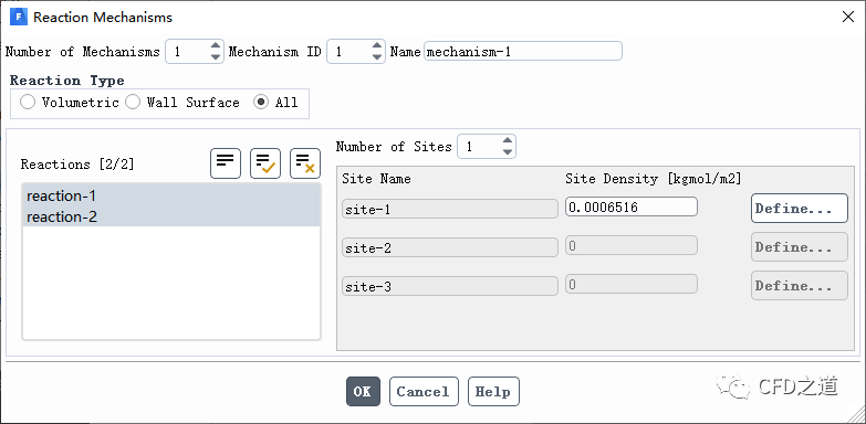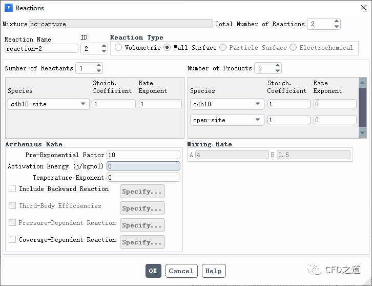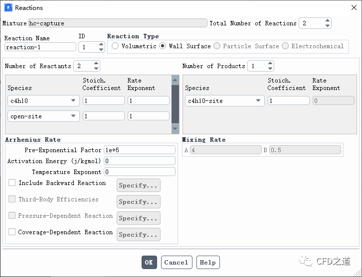 如下图所示设置第一个化学反应,注意选择化学反应类型为Wall Surface