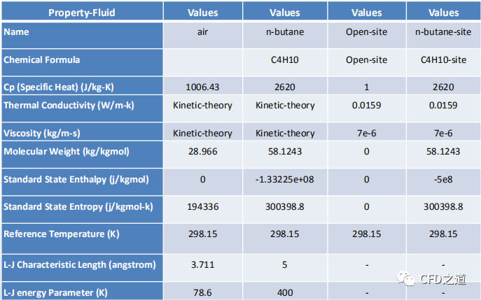 按下表所示参数创建四种fluid材料air、n-butane、Open-site、n-butane-site