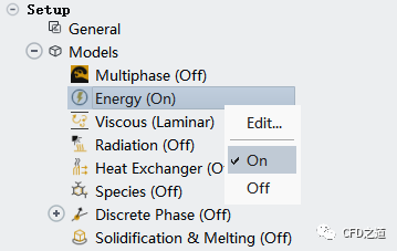 如下图所示鼠标右键选择模型树节点Models > Energy,点击弹出菜单项On激活能量方程