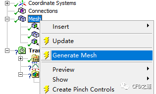 右键选择模型树节点Mesh,点击弹出菜单项Generate Mesh生成网格