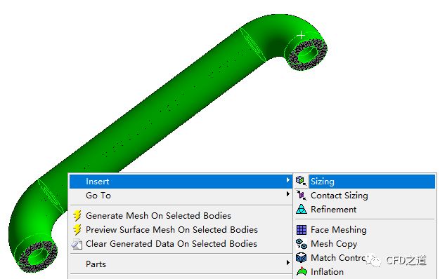选择管道的内外壁面,点击鼠标右键,选择弹出菜单项Insert → Sizing插入面网格尺寸