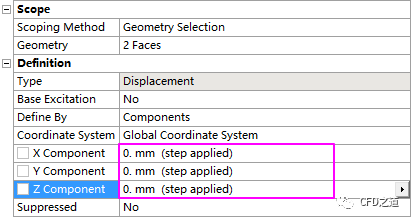 注:这里采用位移约束而不是固定约束。若刚才用Fixed Support约束,则这两个面上不仅位移被约束为0,同时温度也被约束为0 C。