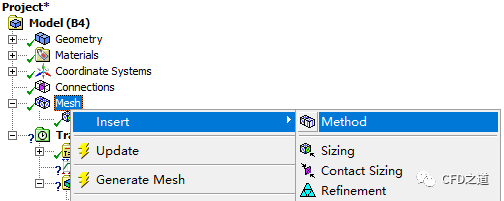 右键选择节点Mesh,点击弹出菜单项Insert → Method插入网格生成方法