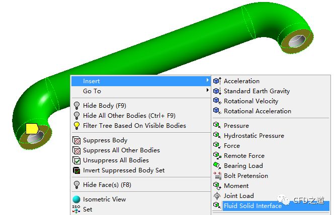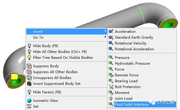 选择管道及外壁面,图形窗口中点击鼠标右键,选择弹出菜单项Insert → Fluid Solid Interface插入流固耦合面