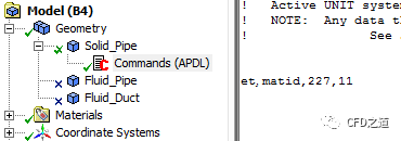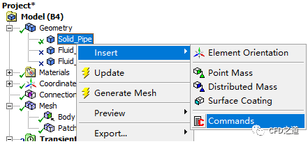 右键选择模型树节点Solid_Pipe,点击弹出菜单项Insert → Commands插入APDL命令