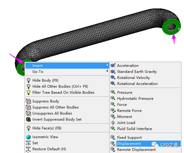 选择管道两个端面,点击鼠标右键,选择弹出菜单项Insert → Displacement插入位移约束