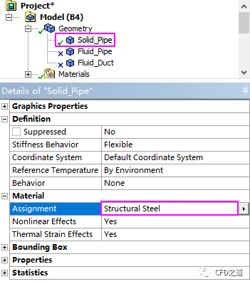 选中节点Solid_Pipe,属性窗口中指定其材料为Structural Steel,如下图所示