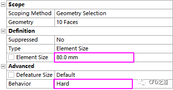 如下图所示,指定Element Size为80 mm,指定Behavior为Hard