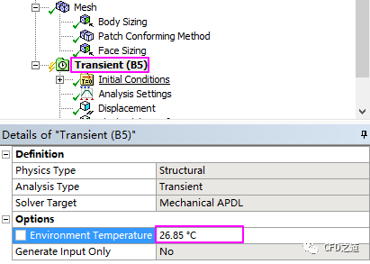 选择模型树节点Transient,属性窗口中设置Environment Temperature为26.85 C