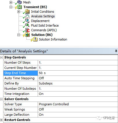 点击模型树节点Analysis Settings,属性窗口中如图所示设置:Number of Steps = 1,Step End Time =50 s,Auto Time Stepping = Off,Define By = Substeps,Number of Substeps = 1,Time Integration = On