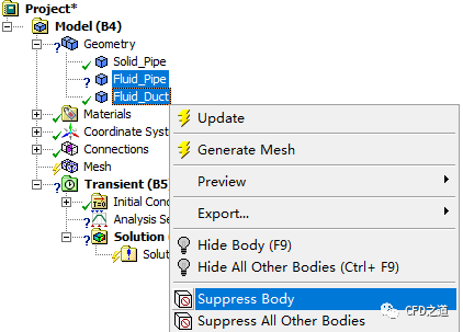 选择Geometry节点下子节点Fluid_Pipe及Fluid_Duct,点击鼠标右键,选择弹出菜单项Suppress Body删除流体计算区域几何