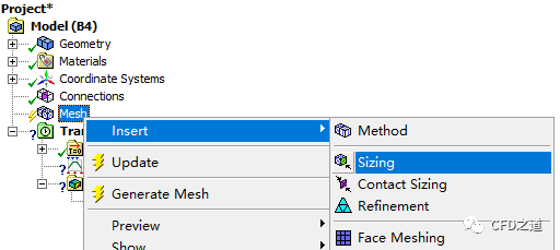 右键选择模型树节点Mesh,点击弹出菜单项Insert → Sizing插入网格尺寸