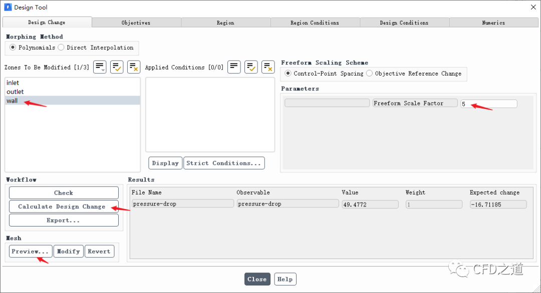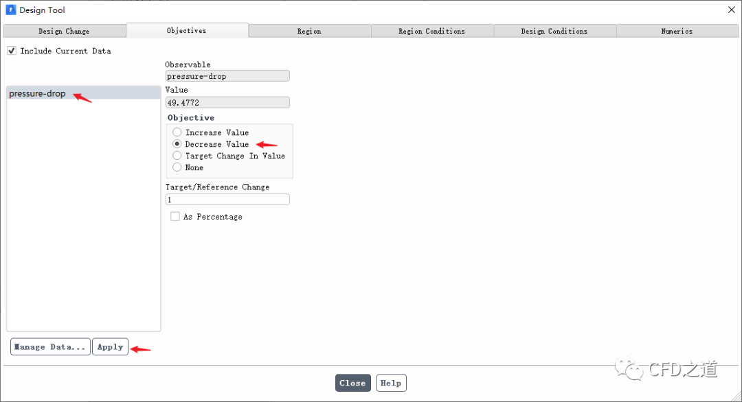 进入Objectives标签页,如下图所示,选择列表项pressure-drop,选择选项Decrease Value,点击按钮Apply