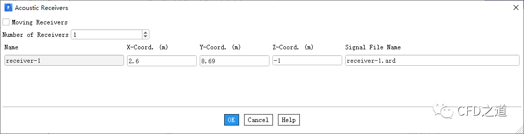 点击Acoustics Model面板中的Define Receivers…按钮打开接收器设置对话框,如下图所示设置接收器位置